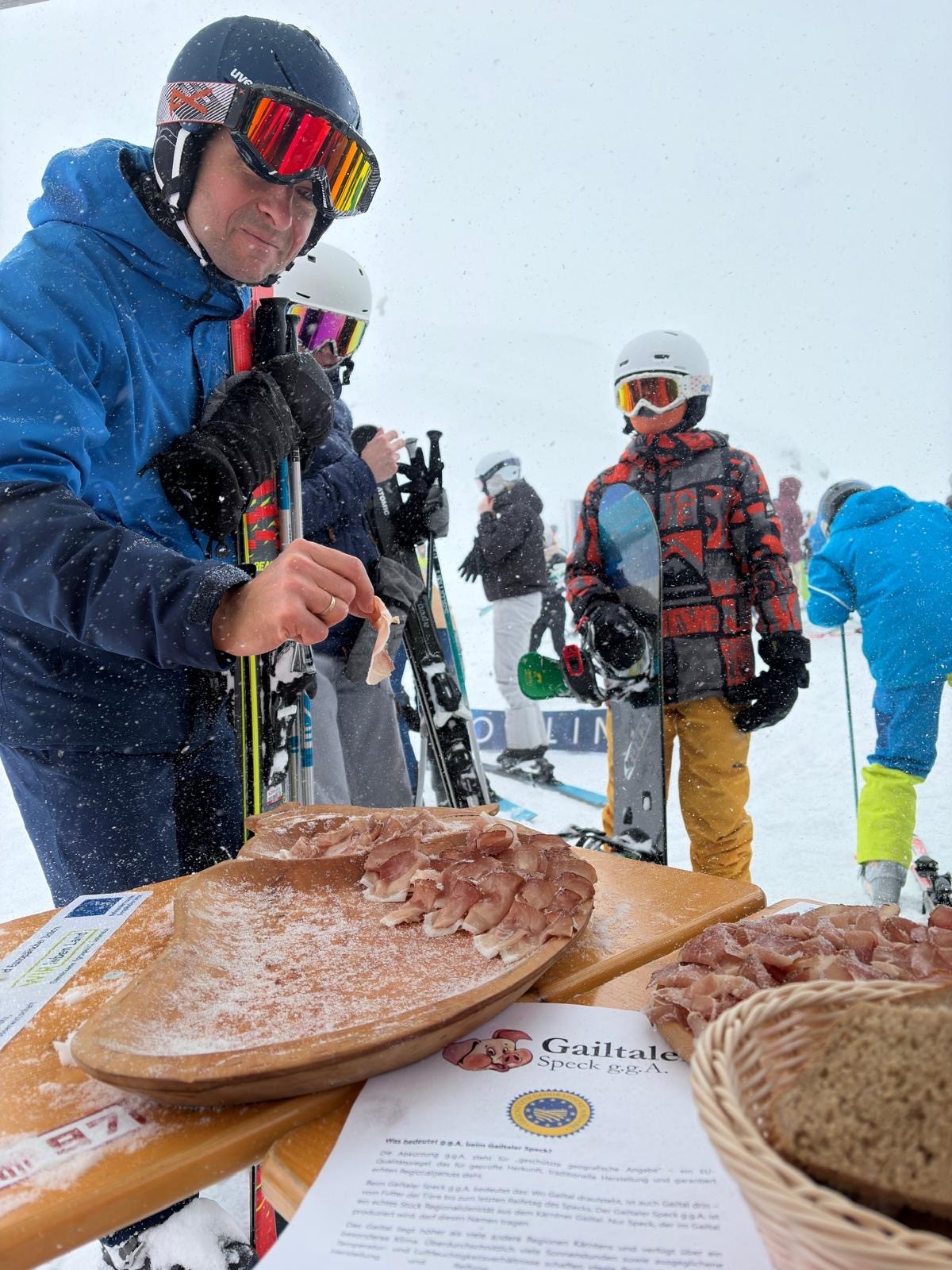 Bei leichtem Schneefall und echter Winteridylle wurde am Freitag, dem 20.02.2026, am Nassfeld zur genussvollen Speckverkostung geladen. Zahlreiche Besucherinnen und Besucher nutzten die Gelegenheit, den unverwechselbaren Geschmack des Gailtaler Speck g.g.A. inmitten der verschneiten Bergkulisse zu erleben.
