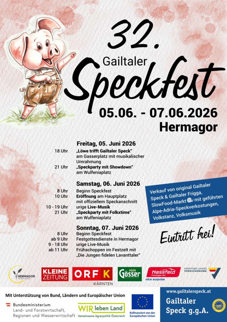 Der Verein Gailtaler Speck g.g.A. – Naturarena Kärnten tritt auch im Jahr 2026 als Veranstalter des Gailtaler Speckfests auf und unterstreicht damit seine zentrale Rolle als Impulsgeber für die regionale Genusskultur. Von 05. bis 07. Juni 2026 organisiert der Verein das 32. Gailtaler Speckfest in Hermagor und schafft damit erneut eine Plattform für Qualität, Regionalität und gelebtes Brauchtum.